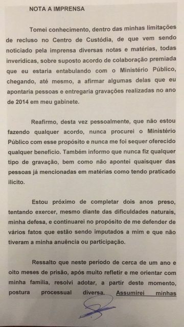 "Assumirei minhas responsabilidades perante o Poder Judiciário, confessando fatos pontuais naqueles processos que eu realmente tenha praticado ilícitos penais", diz trecho da nota.