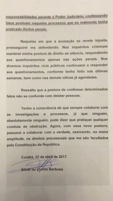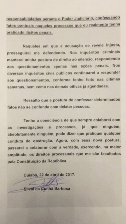 Mediante notícias de que "entregaria" comparsas em crimes de corrupção na condição de delator, o ex-governador Silval Barbosa (PMDB), preso há 1 ano e 8 meses, veio a público, por meio de nota, afirmar que vai confessar participação em ilícitos, mas sem o objetivo de expor outros possíveis envolvidos nas irregularidades apuradas pela Operação Sodoma.