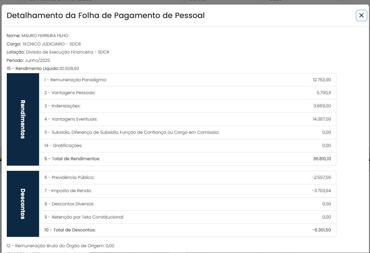 De acordo com o Portal da Transparência, por meio de levantamento detalhado dos vencimentos, o salário bruto de Mauro Filho possui o valor expressivo de R$ 36.810,10. A composição desse montante chama atenção pela variedade das verbas recebidas.