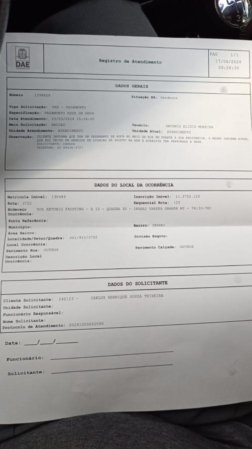 , o morador disse que já procurou a empresa responsável pelo serviço do município pelo menos 4 vezes e nada foi feito para resolver o problema do vazamento. Afirmou que fez várias reclamações ao Departamento de Água e Esgoto de Várzea Grande (DAE) e não obteve resposta.