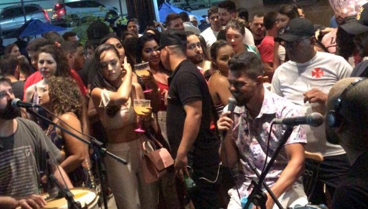 mostra dezenas de clientes sem máscaras, aglomerados em pequeno espaço. Não há distanciamento entre os cantores e o público, muito menos entre as mesas.