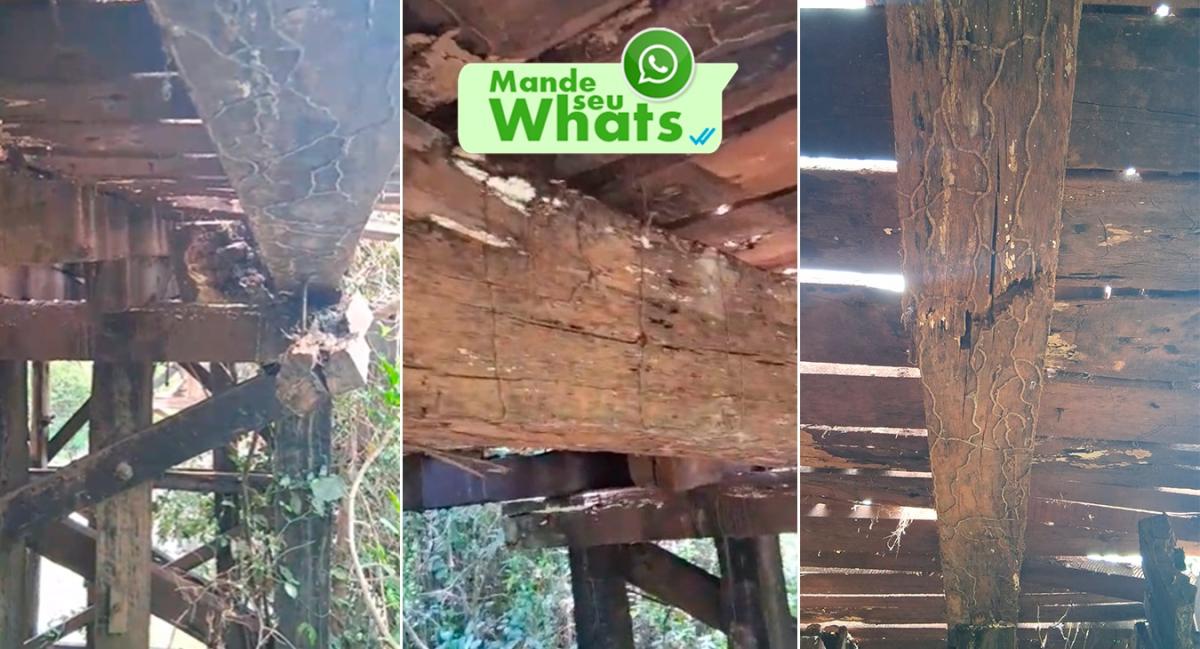 Vídeos gravados sob a ponte mostram parte da estrutura tomada por cupins e o medo dos moradores é de que ela ceda com a passagem de veículos mais pesados, como caminhões e ônibus escolares.