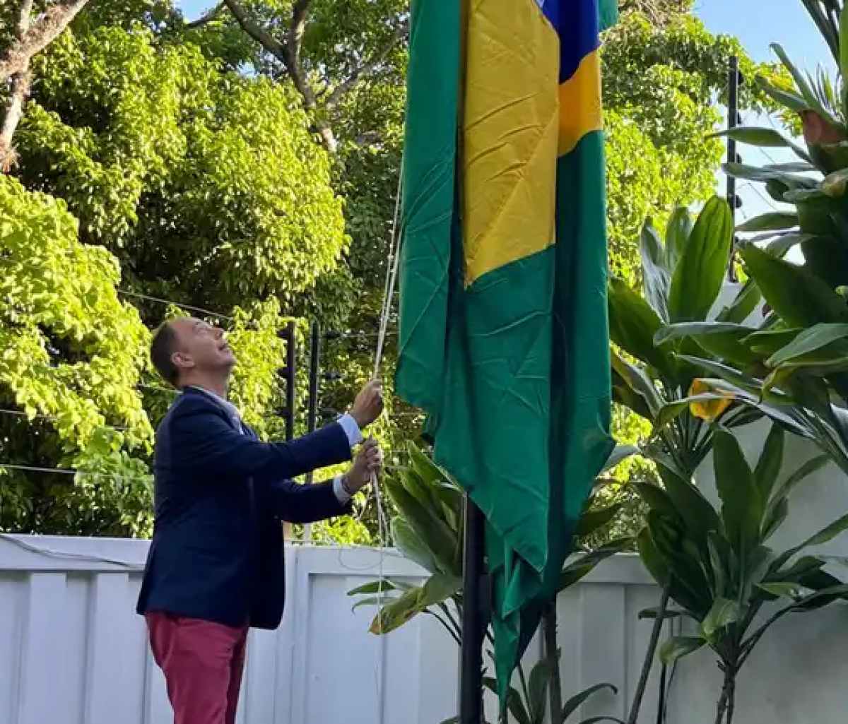 A ministra de Relações Exteriores, Comércio Internacional e Culto da Argentina, Diana Mondino, também publicou na rede social X a foto do hasteamento da bandeira brasileira, na manhã desta quinta-feira (1º), na residência do embaixador da Argentina, no solo venezuelano. a foto do hasteamento da bandeira brasileira, na manhã desta quinta-feira (1º), na residência do embaixador da Argentina, no solo venezuelano.