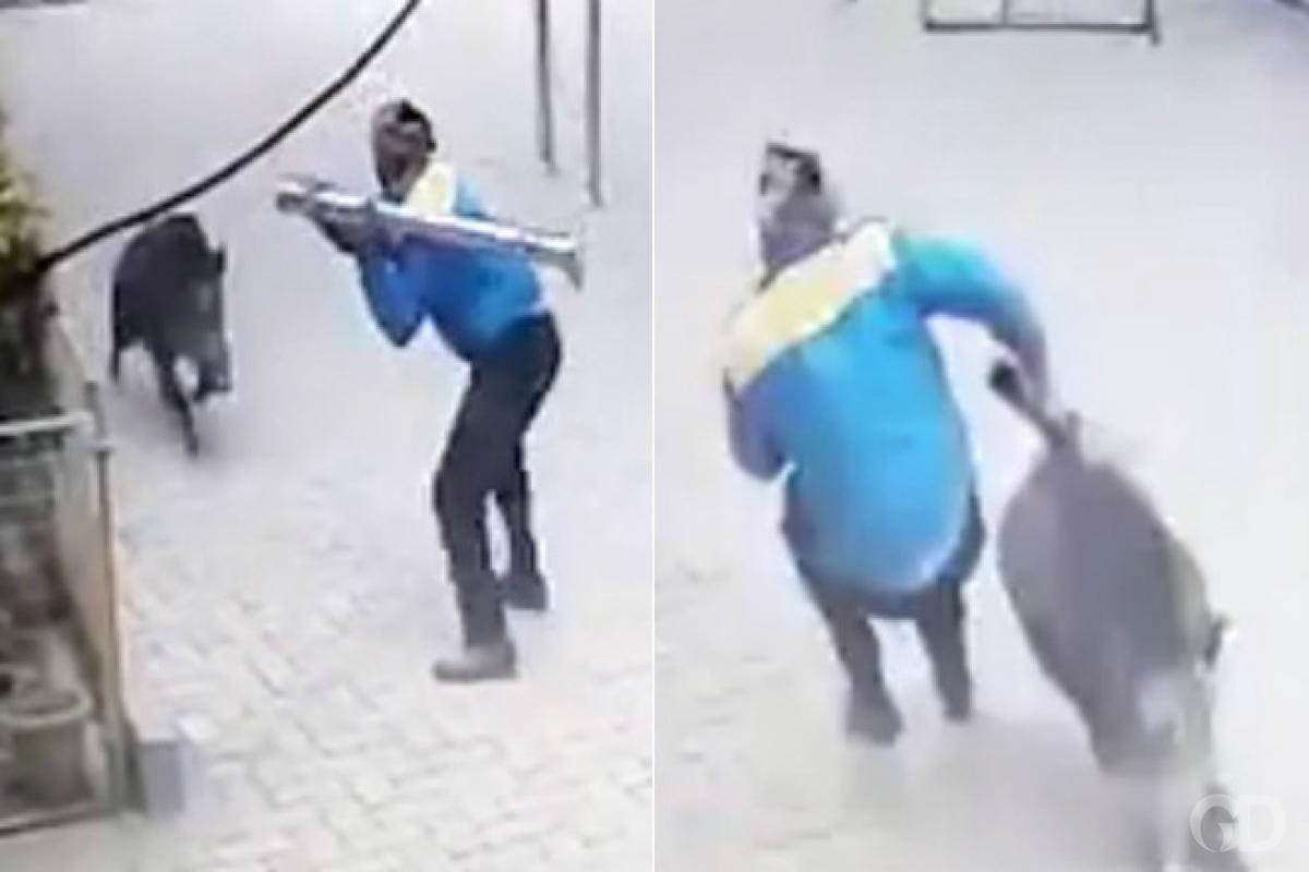 Um porco selvagem invadiu um posto de gasolina em Sultanpur, na Índia, e deixou um funcionário e um cliente feridos.