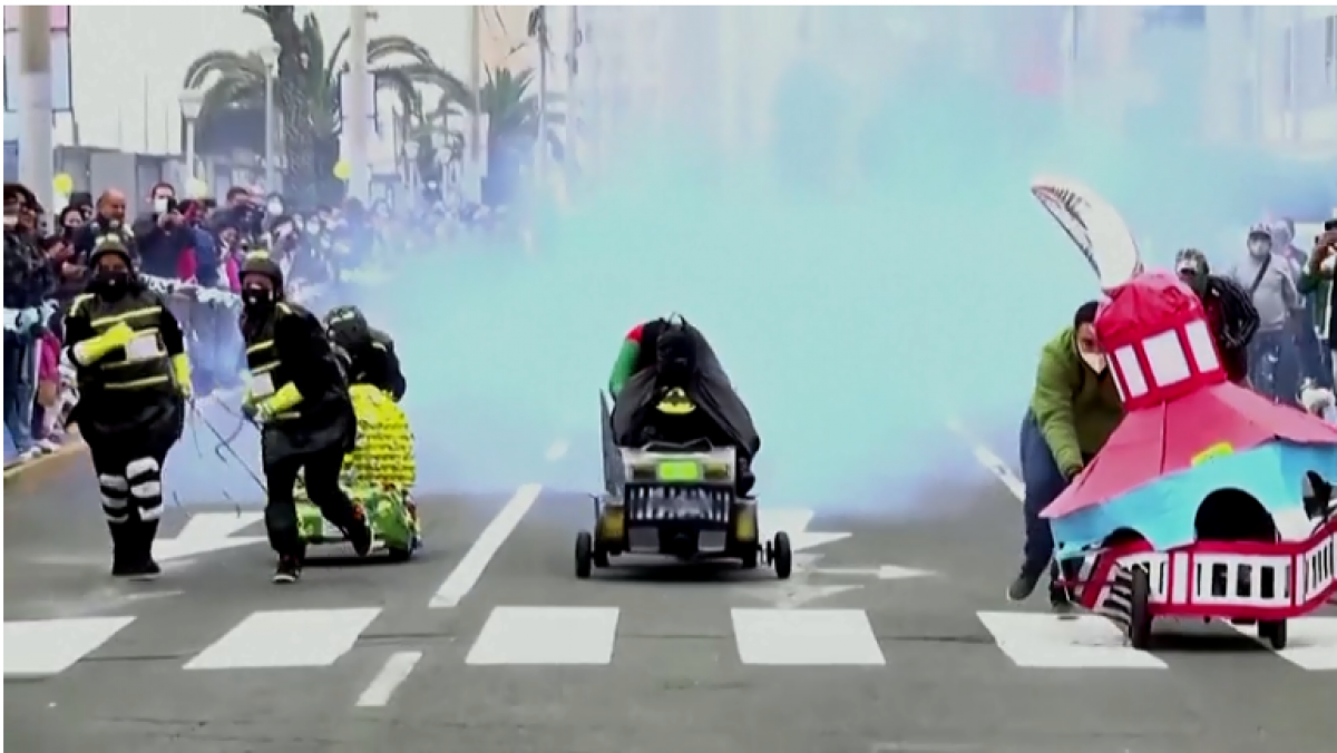 Carros feitos de materiais reciclados disputam corrida no Peru.