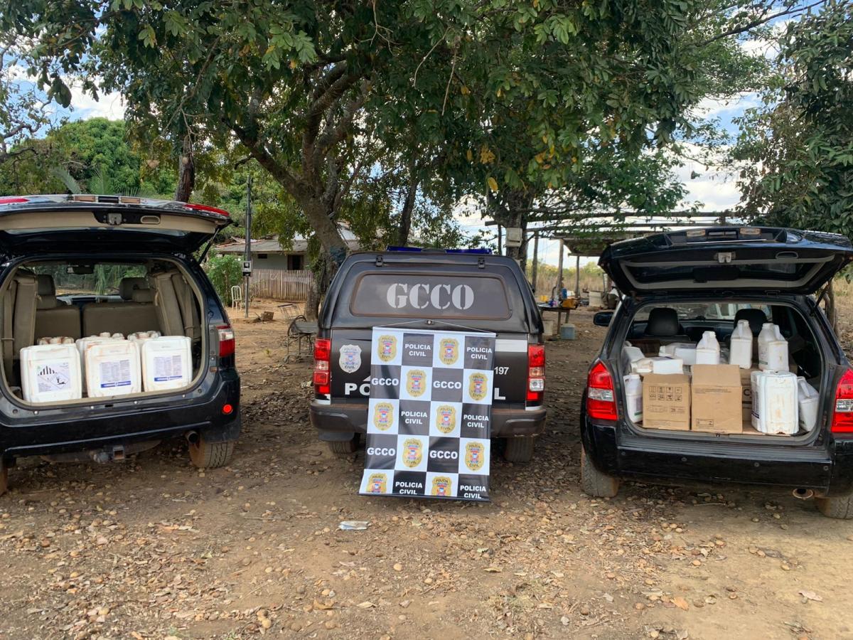 Com base nas informações, os policiais da GCCO, com apoio da equipe da Derf de Primavera do Leste, foram ao sítio, onde, logo no acesso da propriedade, perceberam a grande quantidade de veículos no local. Em busca feita em dois dos veículos, foi encontrada grande quantidade de defensivos agrícolas, muitos deles ainda na caixa.