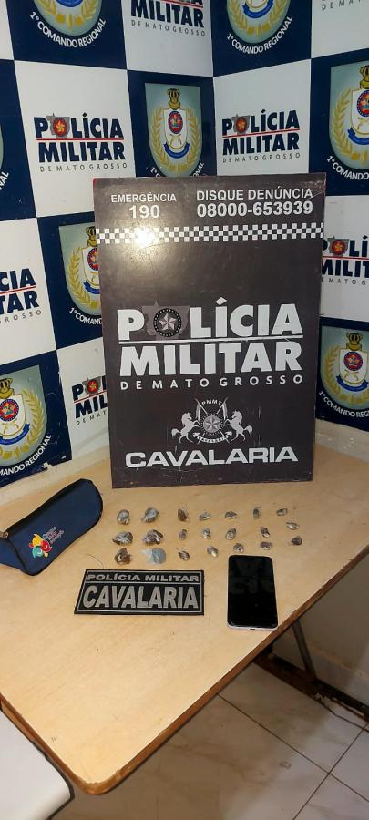 Diante da situação, os policiais realizaram a abordagem e, durante a revista pessoal, encontraram um estojo da mesma cor contendo 21 porções de substância análoga à maconha.