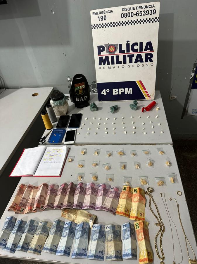 Casal de traficantes foi preso durante uma ação do GAP contra o tráfico de drogas na noite de quarta-feira (28), em Várzea Grande. Com eles, a polícia apreendeu 62 porções análoga à pasta base, correntes, dinheiro e 4 celulares.