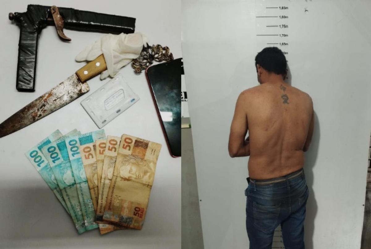 Na bolsa em que estava com ele, os policiais encontraram o dinheiro levado da casa, uma arma artesanal e uma faca tipo peixeira. Dentro ainda estavam um shorts e uma calcinha, que foi reconhecida como sendo de uma das vítimas.