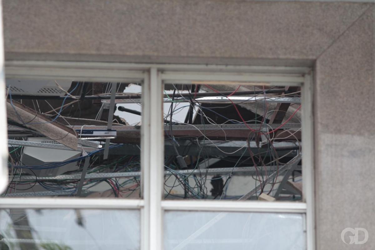 Com o impacto da explosão, o teto da agência ficou destruído, bem como os caixas.