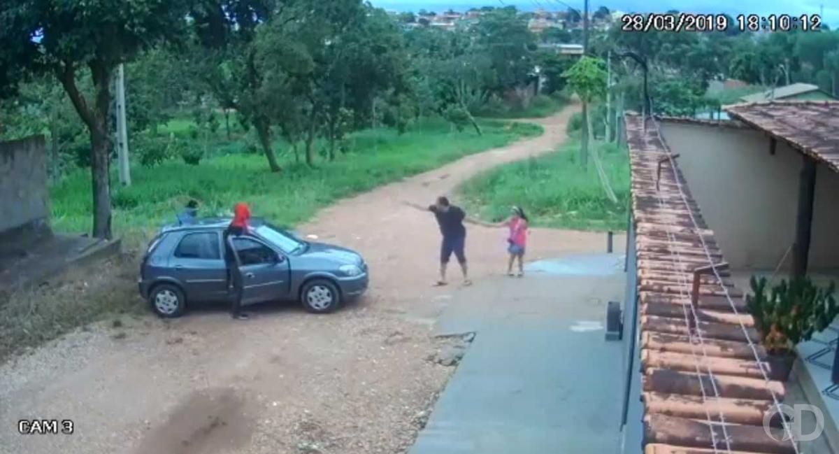 Enquanto as vítimas esperam o portão abrir, os suspeitos aparecem aos fundos do muro e em seguida pulam, já anunciando o assalto. Com a abordagem, todos se desesperam e tentam sair do carro. O veículo sai de ré com o idoso e a criança, no momento em que o pai tenta tirar a menina um deles dispara um tiro.
