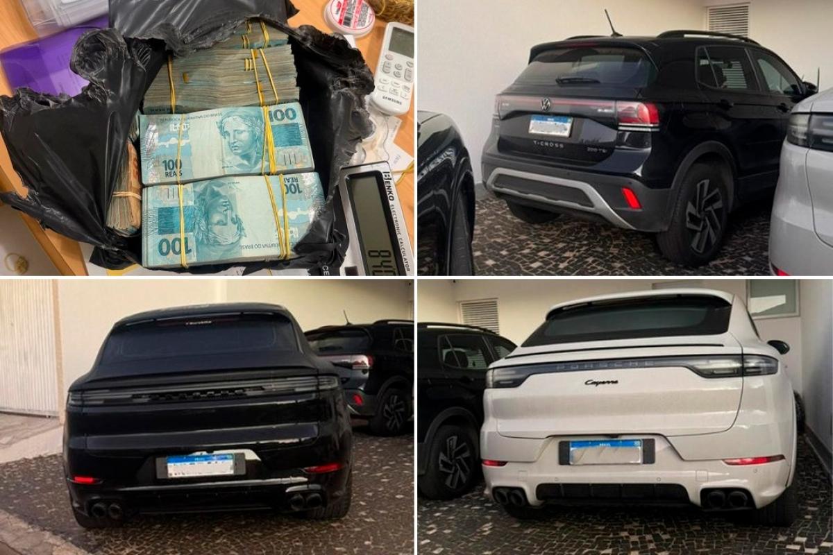 Na ocasião, foram apreendidos uma sacola plástica com maços de notas de R$ 100, um Porsche Cayenne, um Porsche Macan e um Volkswagen T-Cross apreendidos. Os carros de luxo variam de R$ 170 a R$ 770 mil.