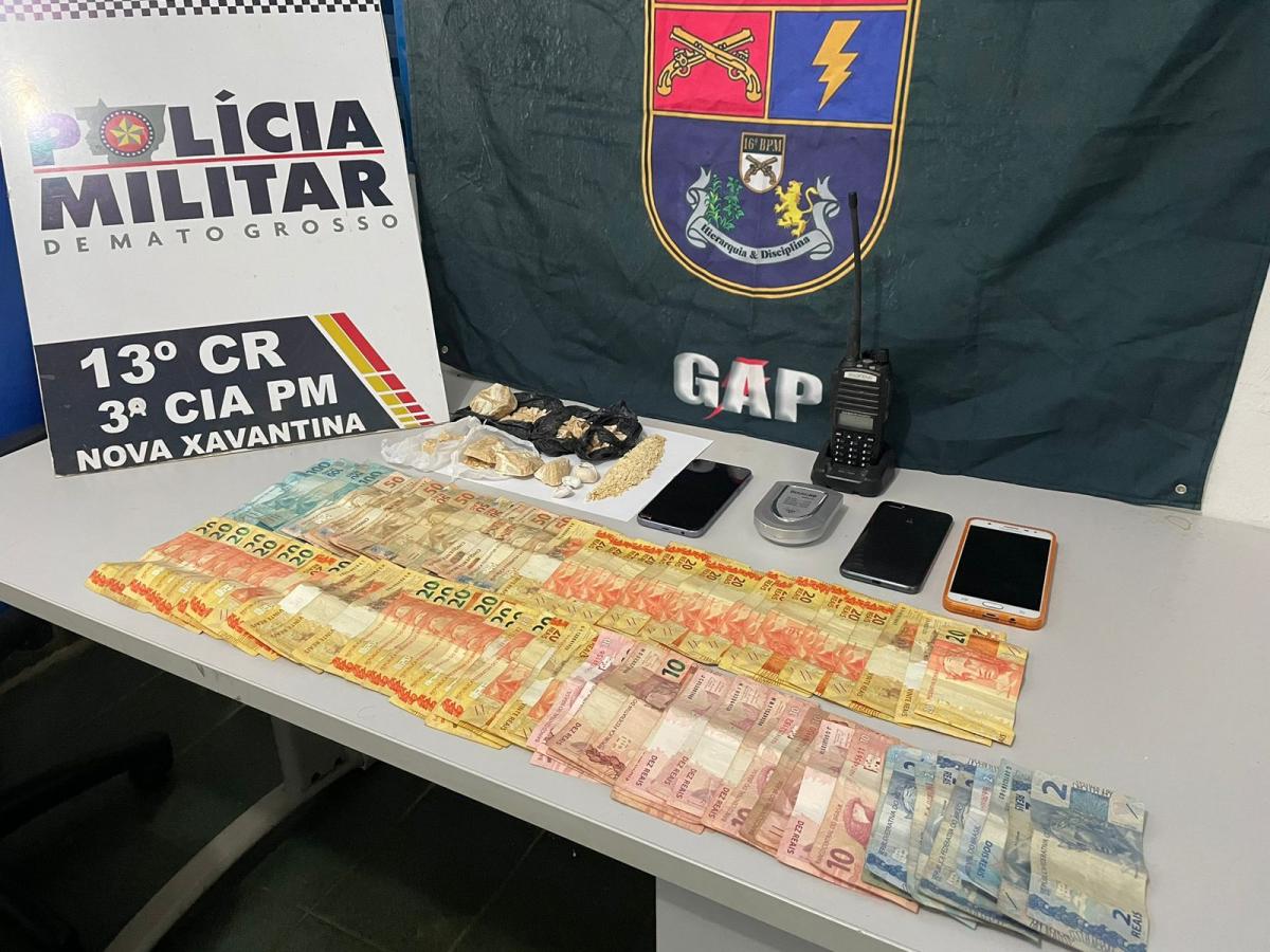 Dois jovens foram presos por tráfico de drogas, em Nova Xavantina, neste sábado (11). Com eles, o Grupo de Apio da Polícia Militar apreendeu mais de R$ 2 mil e 11 porções de pasta base de cocaína.
