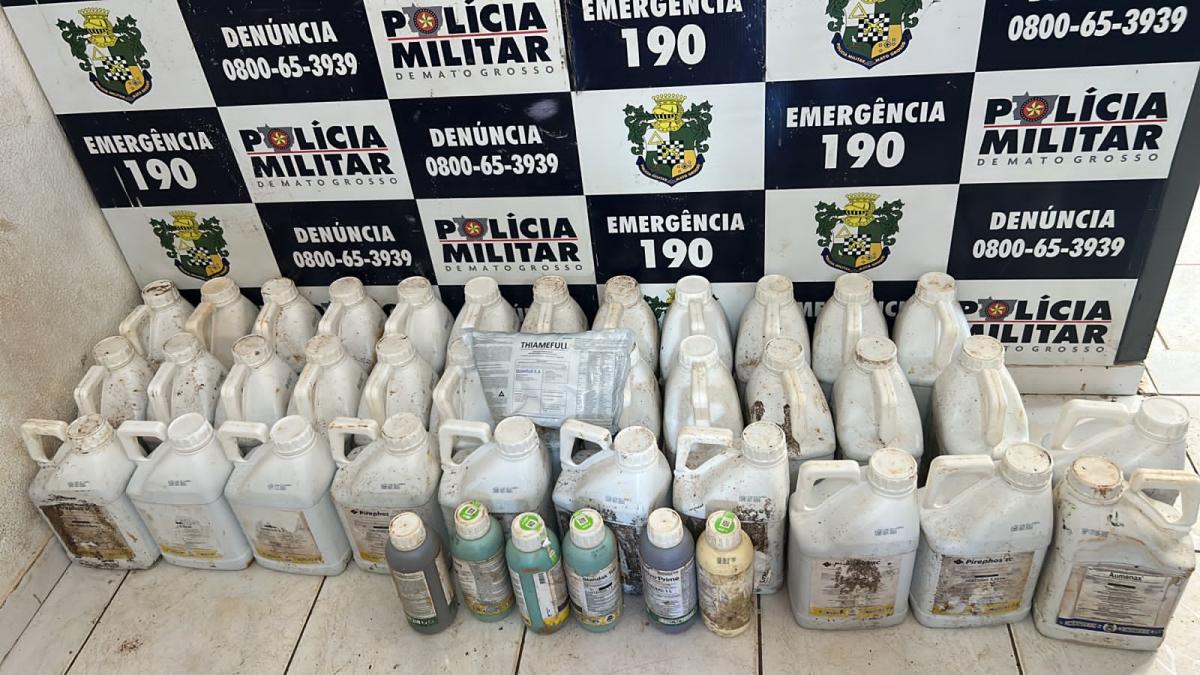 Policiais militares do 12º Batalhão apreenderam, na noite de quinta-feira (27), 41 galões de defensivos agrícolas de origem ilícita, duas porções de cocaína e prenderam um homem, de 32 anos, por furto e uso ilícito de drogas, no bairro Serra Dourada, em Sorriso (397 km de Cuiabá).