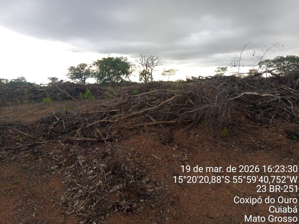 Uma área de desmatamento irregular foi identificada pela Polícia Militar Ambiental na zona rural de Cuiabá, na região do Rio dos Peixes, às margens da MT-251, sentido Chapada dos Guimarães.