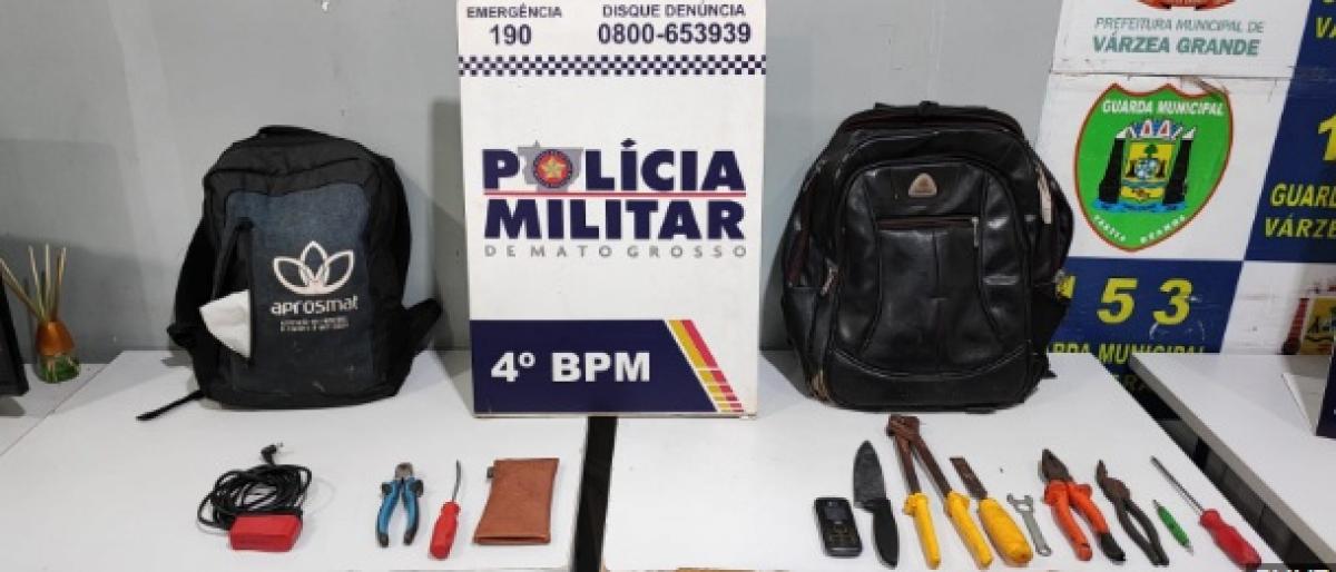 Dois homens foram presos em flagrante tentando furtar uma churrascaria, na madrugada desta quarta-feira (29), no Centro de Várzea Grande. Com os suspeitos foram apreendidas duas mochilas contendo ferramentas utilizadas na ação criminosa.