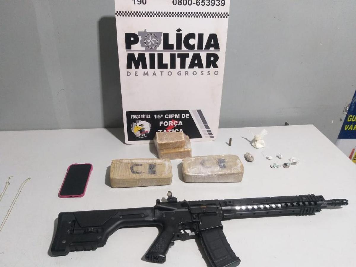 Policiais militares da Força Tática prenderam dois homens, de 18 e 30 anos, por tráfico de drogas, porte ilegal de arma de fogo e utilização de simulacro de arma para cometer crimes, na noite desta segunda-feira (24), em Várzea Grande. Uma réplica de fuzil, tabletes e porções de entorpecentes foram apreendidos.