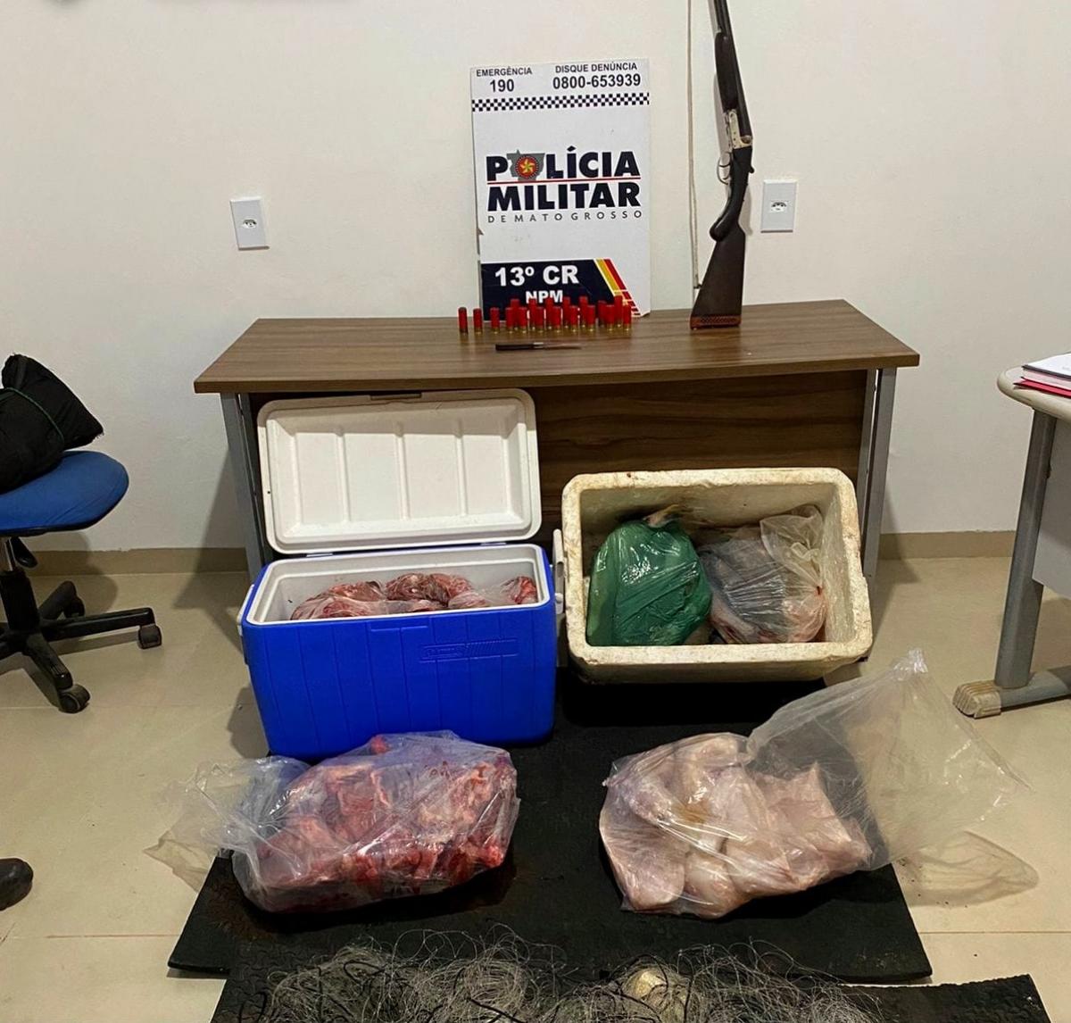 Um homem, não identificado, foi preso nesta manhã de domingo (31), por porte ilegal de arma de fogo e caça de animais silvestres, em Cocalinho (923 km a leste de Cuiabá). Ele estava com carne de cateto e jacaré.