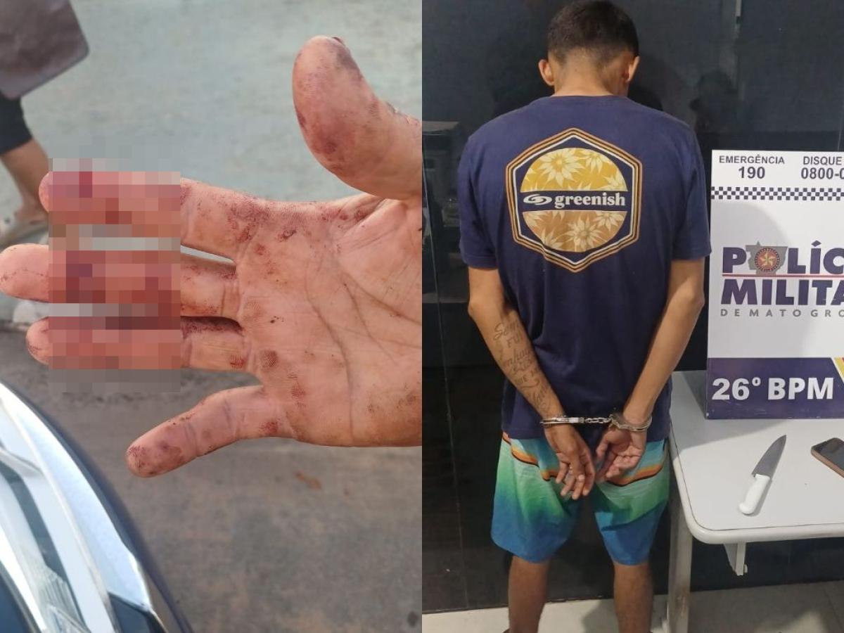 Homem teve a mão cortada por uma faca, ao tentar ajudar uma amiga vítima de roubo, no bairro Colina 2, em Nova Mutum (264 km ao norte de Cuiabá). Em rondas, a polícia encontrou e prendeu o suspeito.