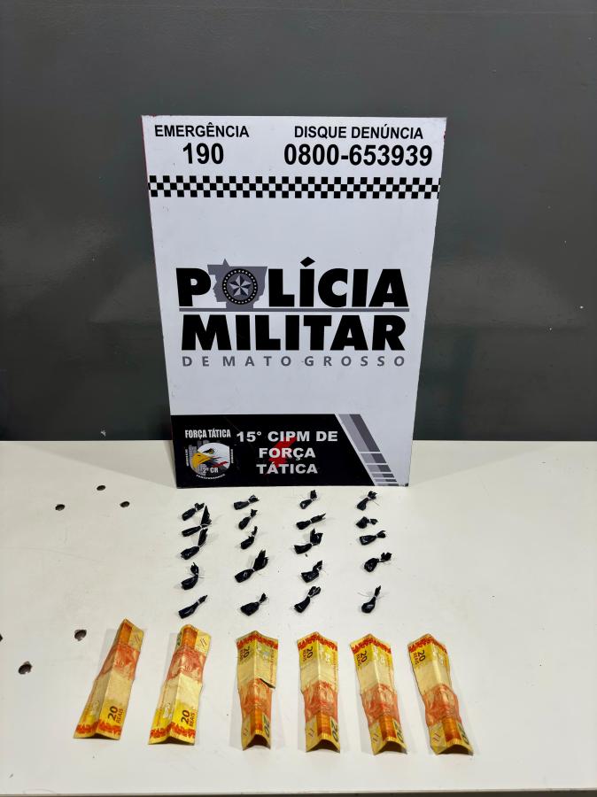 Os agentes se deslocaram até o local e em contato com o pai do suspeito, ele autorizou a busca no interior do imóvel, sendo localizadas, sob o travesseiro do quarto indicado, mais 10 porções de análoga à cocaína e a quantia de R$120,00 em espécie.
