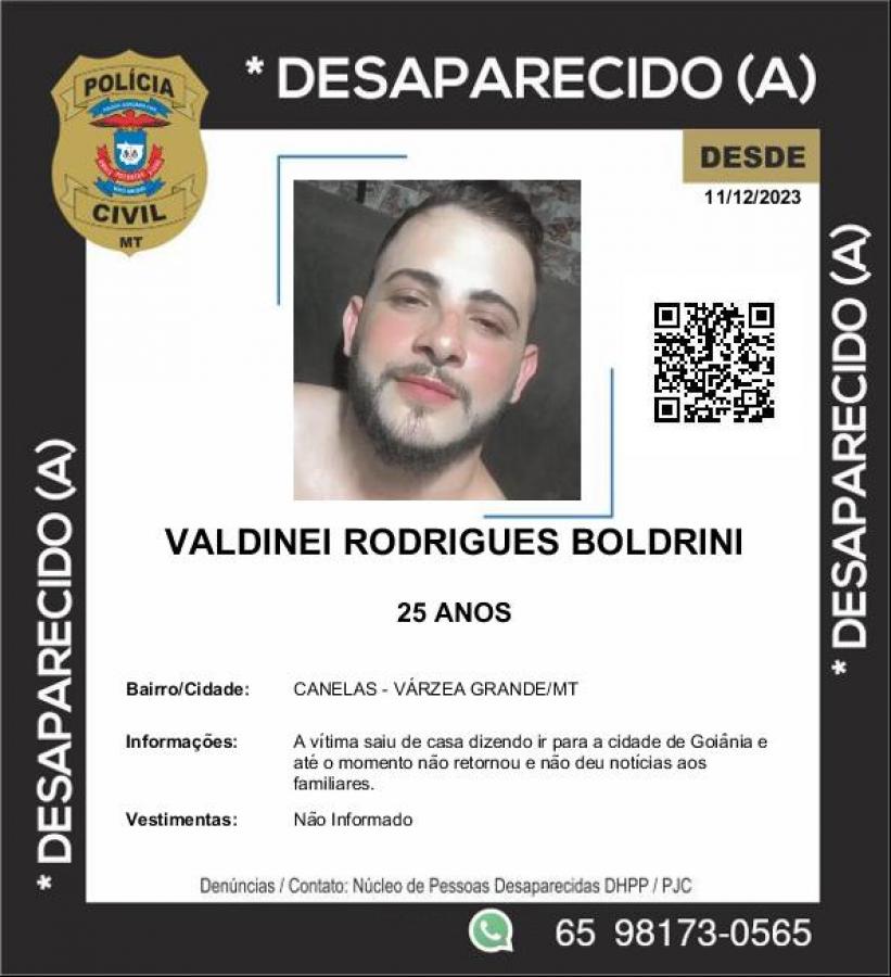 Valdinei Rodrigues Boldrini,25, está desaparecido desde o dia 10 de dezembro, quando saiu de carro de Várzea Grande com destino à Goiânia.