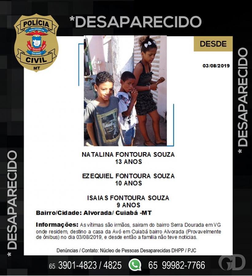 Três crianças, com idades de 13, 11 e 9 anos estão desaparecidas desde a última sexta-feira (2), em Cuiabá. Elas deveriam ter ido para a escola, mas mudaram o caminho rumo à casa da avó. Desde então, não foram mais vistas.