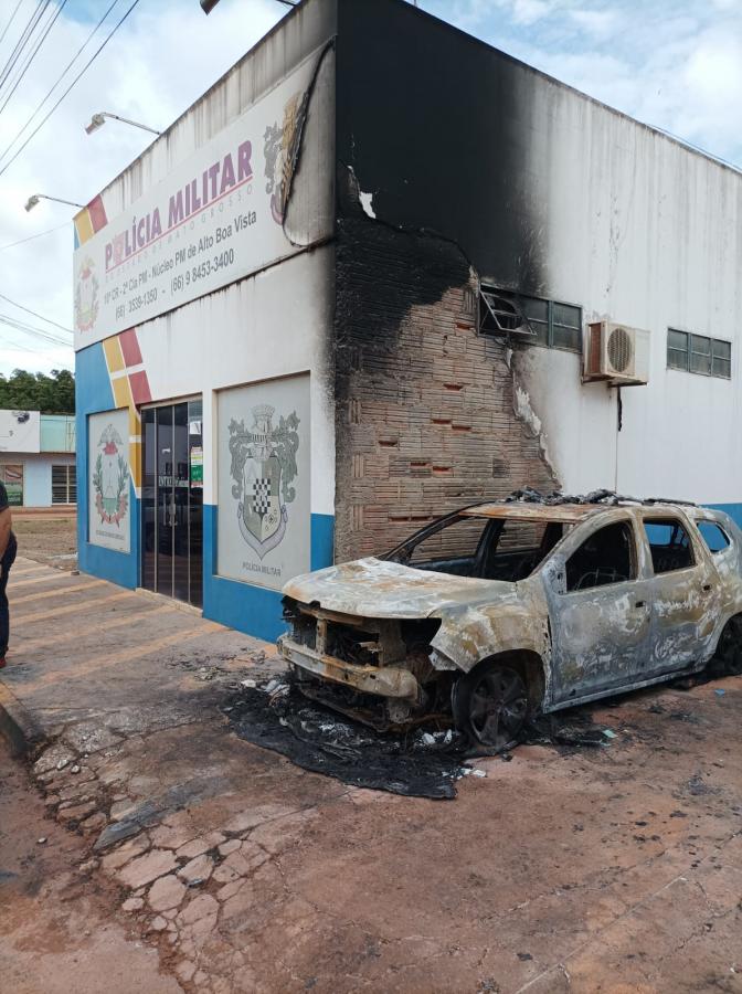 O atentado ocorreu por volta da 00 horas desta sexta-feira, quando os criminosos atearam fogo na viatura Renault Duster, no Núcleo da PM de Alto Boa Vista, sendo as chamas contraladas com uso de extintores.