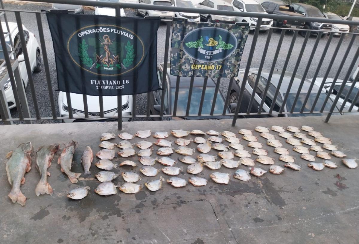 Foram apreendidos 20,750 kg de pescado, contendo exemplares de pacu-peva, barbado e piau-três-pintas, sendo parte significativa fora das medidas mínimas permitidas pela legislação vigente.