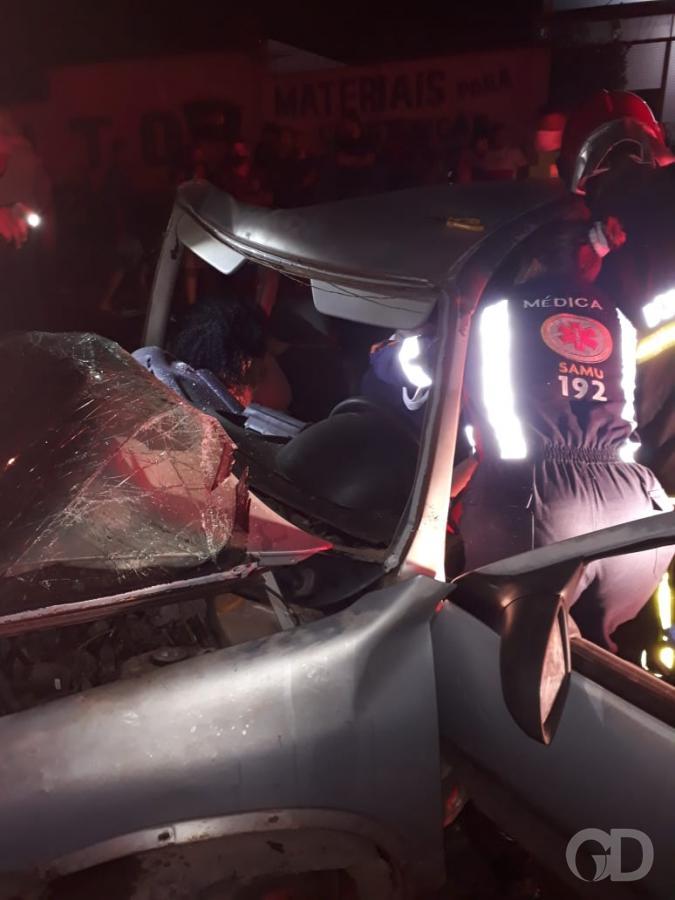 Na gravação é possível ver o momento em que agentes do Samu retiram uma das vítimas do carro, que teve sua parte frontal destruída.