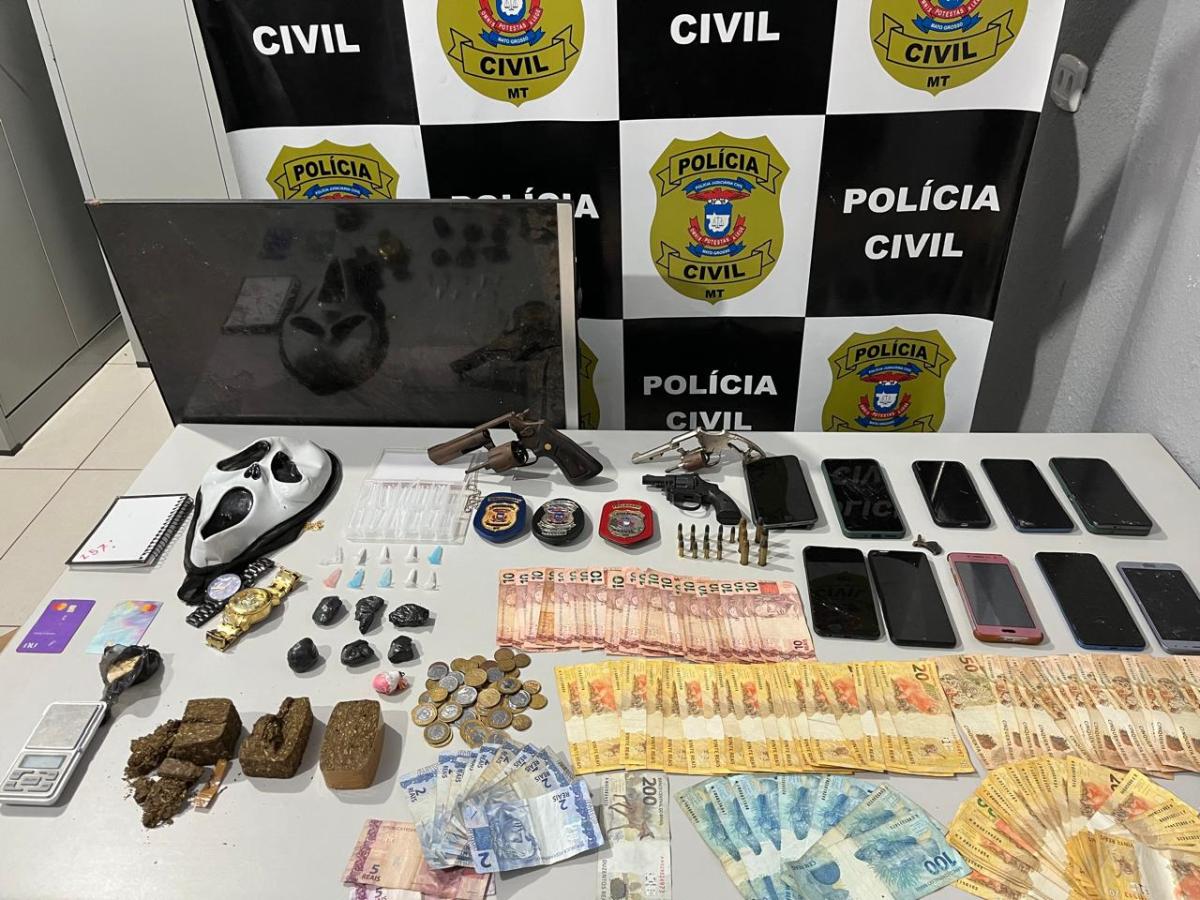 Durante o cumprimento das buscas foram apreendidas armas de fogo, drogas, dinheiro, celulares e diversos objetos de origem ilícita, incluindo itens furtados ou roubados.