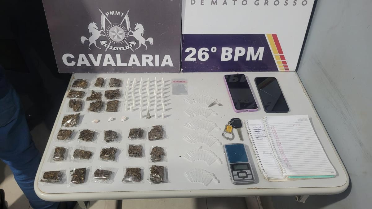 Ao todo, foram apreendidas 25 porções de maconha, três invólucros de pasta base, 52 porções de cocaína, 59 pinos vazios, uma balança de precisão e dois cadernos de anotações.