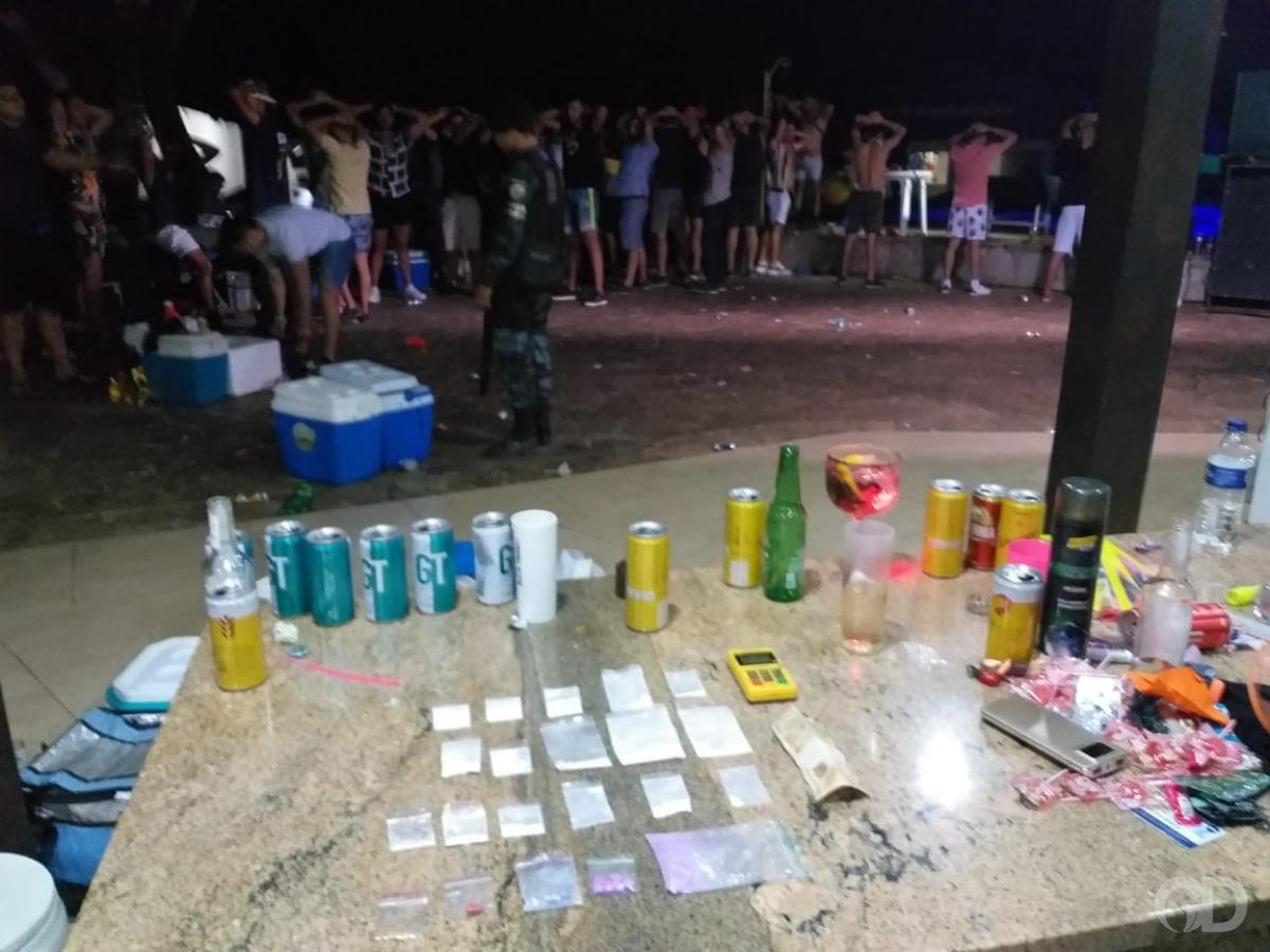 A Polícia Militar encerrou uma festa de aniversário com cerca de 250 pessoas em um chácara da Comunidade Bandeira, em Cuiabá, na madrugada deste domingo (20). Durante as abordagens, os policiais encontraram diversas porções de cocaína e ecstasy.