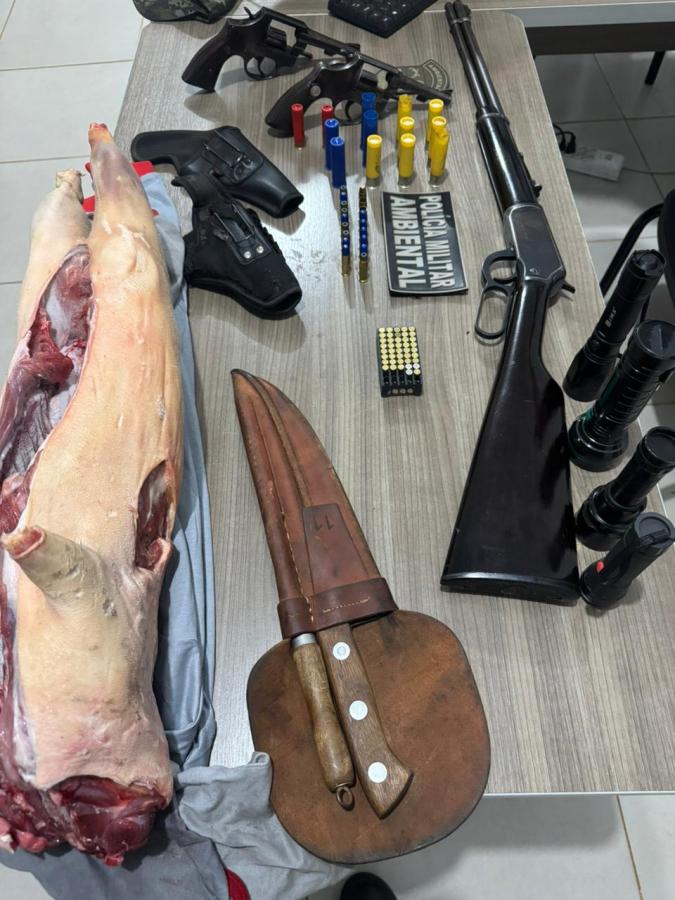 Conforme o boletim de ocorrência, por volta das 18h policiais ambientais durante rondas avistaram um motociclista em atitude suspeita, foi feita abordagem e com ele encontrado uma arma na cintura, uma espingarda na moto além de munições e carne congelada de paca.
