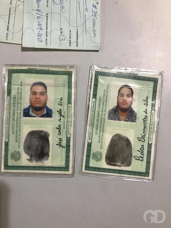 Dois homens acusados de praticar estelionatos em série na Grande Cuiabá foram presos, nesta segunda-feira (30), em Várzea Grande, com 80 carteiras de identidades falsas, 100 cartões de crédito, 70 folhas de cheque, além de dois veículos Jeep Renegade, frutos de golpes em locadoras. Veja a lista completa do material apreendido pela Polícia Militar de Várzea Grande.