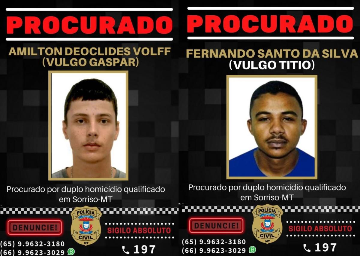 Identificados como assassinos de duas mulheres em março deste ano, a Delegacia da Polícia Civil de Sorriso (420 km ao norte) procura por Amilton Deoclides Volff, conhecido como "Gaspar" e Fernando Santo da Silva, conhecido como "Titio". A foto de ambos foi disponibilizada e a polícia pede ajuda da população para serem presos.