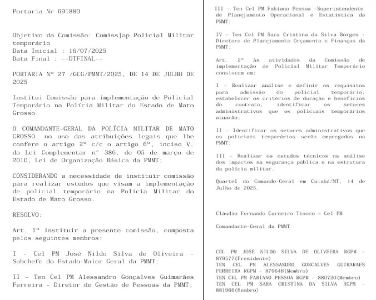 A Portaria N° 27 /GCG/PMMT/2025, do dia 14 de julho de 2025, institui Comissão para implementação de Policial Temporário na Polícia Militar do Estado de Mato Grosso.