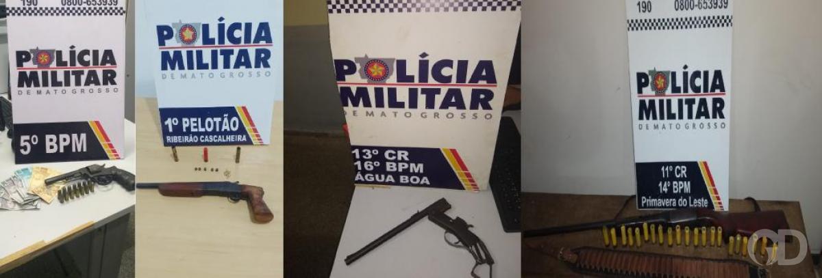 Policiais militares apreendera entre sábado e domingo (28 e 29) seis armas de fogo, sendo três revólveres, uma espingarda, garrucha e arma de fabricação caseira. Os armamentos estavam em seis cidades mato-grossenses. Cinco homens foram presos nas ações.