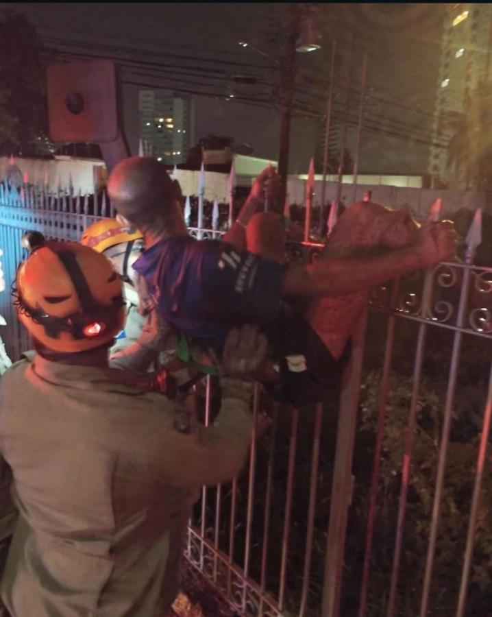 Um sem-teto foi socorrido pelo Corpo de Bombeiros e encaminhado ao Hospital Municipal de Cuiabá (HMC) com um pedaço de grade atravessado em sua panturrilha. Ele tentou invadir uma casa no bairro Goiabeiras e ficou pendurado pela perna na grade do portão, na noite de sexta-feira (22).