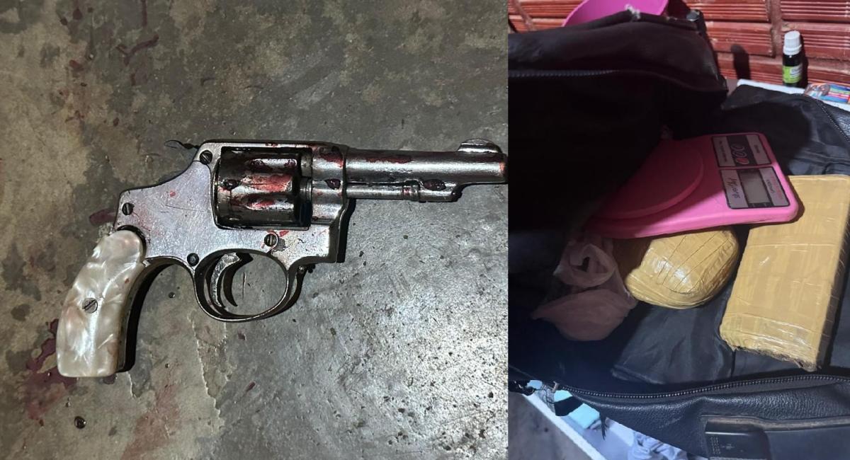 No local do confronto, os policiais apreenderam o revólver calibre .32, além de dois tabletes de maconha e várias porções menores já fracionadas. Todo o material ilícito recolhido foi encaminhado à delegacia para o registro da ocorrência e devidas providências.