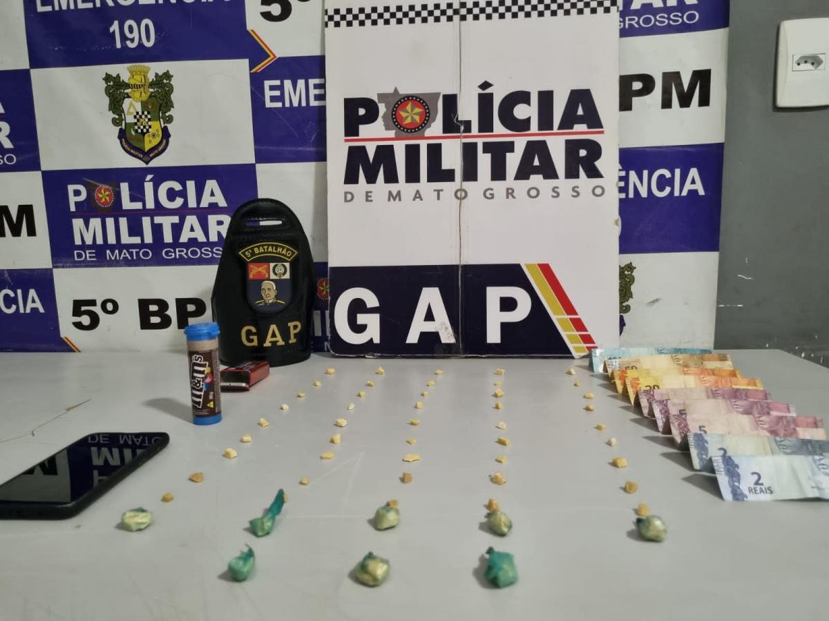O suspeito fugiu em alta velocidade, mas foi abordado na rua Rosa Bororo. Com ele foi encontrado 45 pedras de cocaína além de outras porções e R$ 209. Questionado, ele informou que pegou a droga com um terceiro para repassar no bairro.