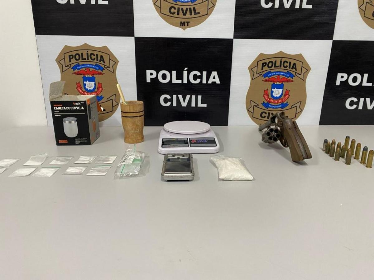 Em revista no carro, os policiais encontraram papelotes de cocaína, além de algumas embalagens vazias, demonstrando a atuação com o comércio de entorpecentes. Questionado, o suspeito confessou ser integrante de facção criminosa e revelou que havia mais drogas armazenadas em sua casa e uma arma de fogo escondida na residência de sua mãe.