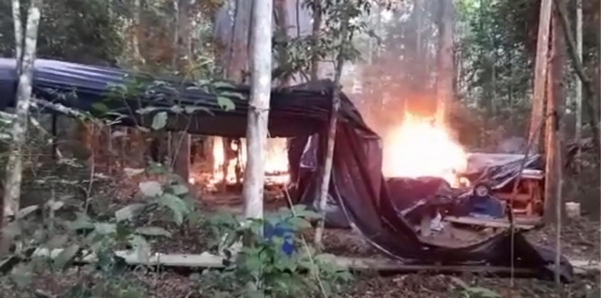 Nas imagens é possível visualizar as instalações sendo consumidas pelo fogo durante as diligências. As estruturas foram construídas no meio da mata para dar suporte ao tráfico de drogas.