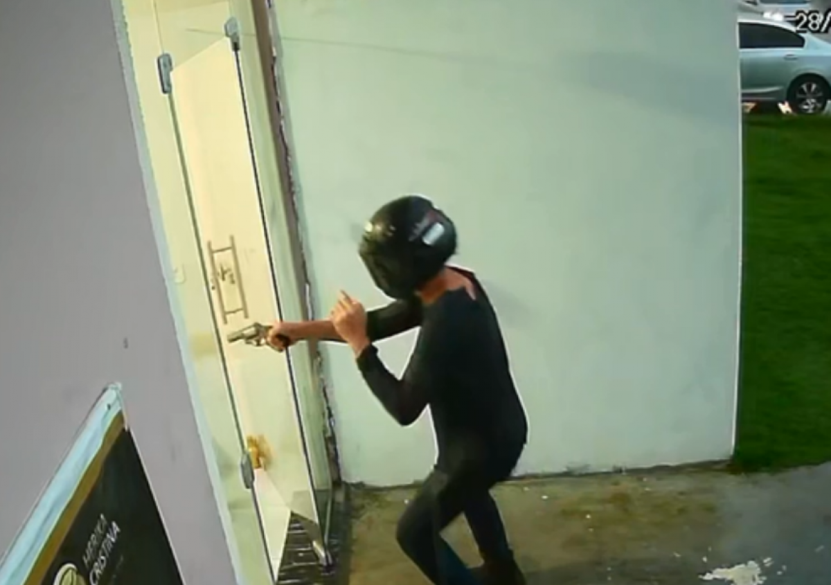 Guilherme chega ao local às 17h47. Cerca de 16 segundos depois, o suspeito aparece nas imagens armado e invade o local. Nesse meio tempo, uma mulher que estava sendo atendida surge na porta, mas retorna para dentro do estabelecimento.