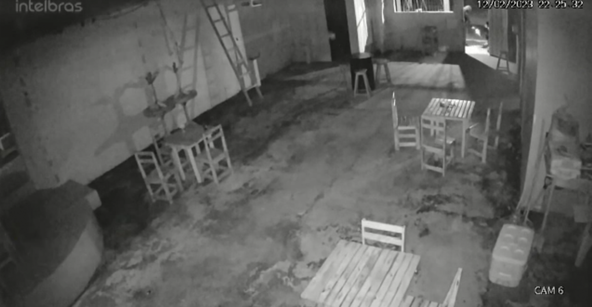 O vídeo mostra duas mulheres sentadas à mesa e mexendo no celular. Em seguida, às 22h25, dois homens chegam no local – armados e encapuzados -, passam pelas mulheres e vão em direção a uma porta.