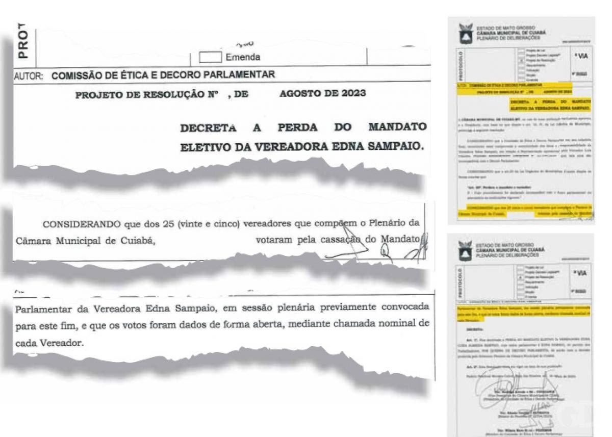 No texto da ata, consta que a decisão da Câmara foi pela cassação do mandato parlamentar da vereadora Edna Sampaio, em sessão plenária previamente convocada para este fim, e que os votos foram dados de forma aberta, mediante chamada nominal de cada vereador, diz trecho do documento que a reportagem teve acesso.