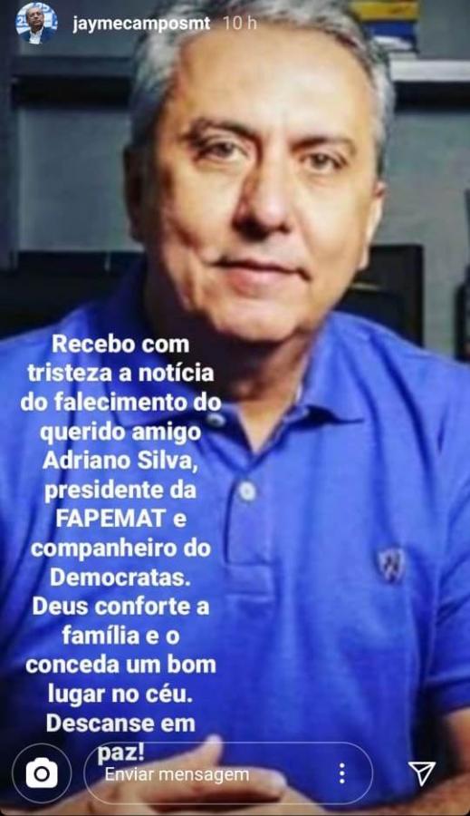 O senador Jayme Campos (DEM) também usou as redes sociais para lamentar a morte do professor. “Recebo com tristeza a notícia do falecimento do querido amigo Adriano Silva, presidente da Fapemat e companheiro do Democratas. Deus conforte a família e o conceda um bom lugar no céu. Descanse em paz”, publicou em seu Instagram.