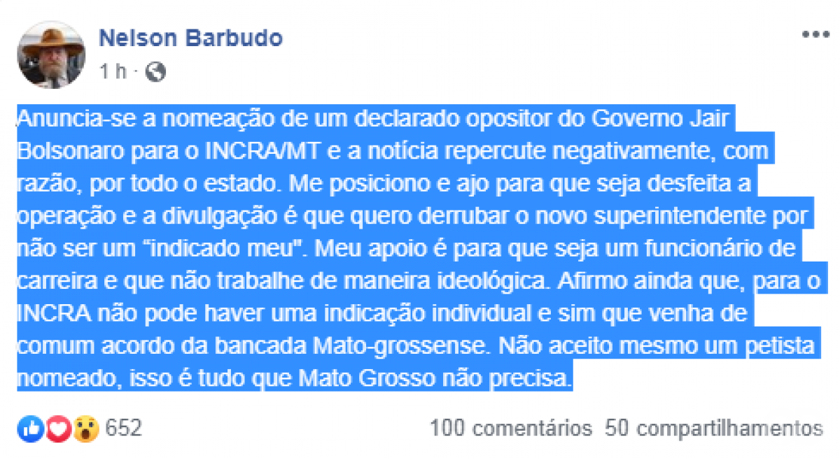 "Meu apoio é para que seja um funcionário de carreira e que não trabalhe de maneira ideológica. Afirmo ainda que para o INCRA não pode haver uma indicação individual e sim que venha de comum acordo da bancada Mato-grossense. Não aceito mesmo um petista nomeado, isso é tudo que Mato Grosso não precisa", reforça um trecho da postagem de Barbudo, na sua contra do facebook.