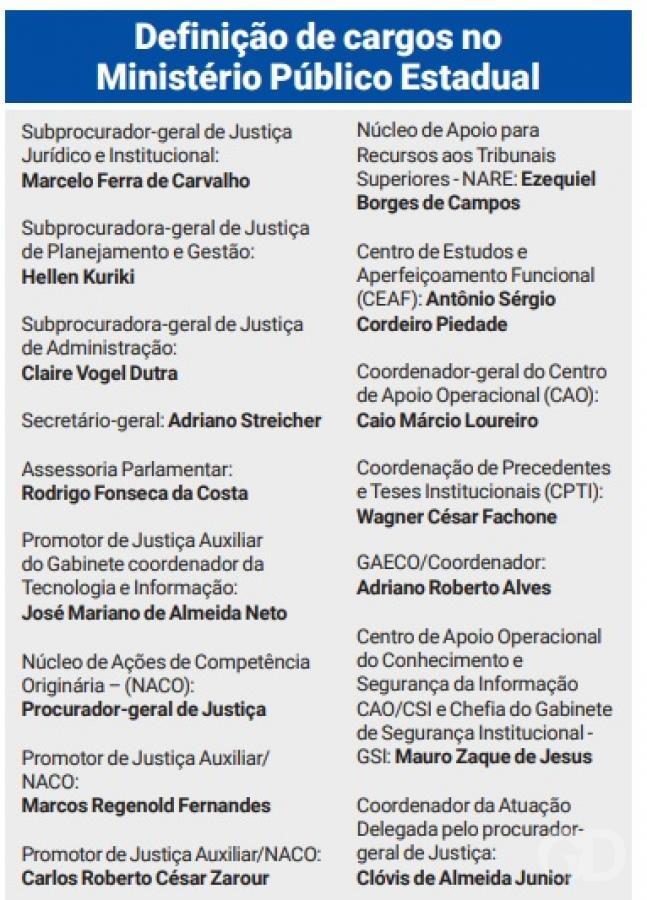 O cargo de subprocuradorGeral de Justiça Jurídico e Institucional ficará com o procurador de Justiça, Marcelo Ferra. A subprocuradora-geral de Justiça de Planejamento e Gestão será ocupada por Hellen Kuriki e na de Administração, fica sob Claire Vogel Dutra O secretário-geral será Adriano Streicher e na assessoria parlamentar o escolhido foi Rodrigo Fonseca da Costa.