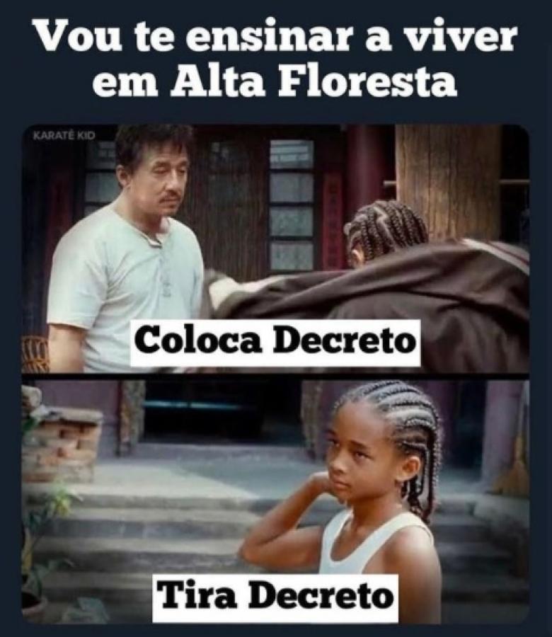 Esse ano também teve a volta dos decretos que restringiam a vida dos moradores por causa da pandemia da covid-19. Em Alta Floresta (803 km ao norte de Cuiabá), por exemplo, a confusão de decretos foi retratada em um meme que utiliza a cena famosa do novo Karatê Kid - coloca casaco, tira casaco.