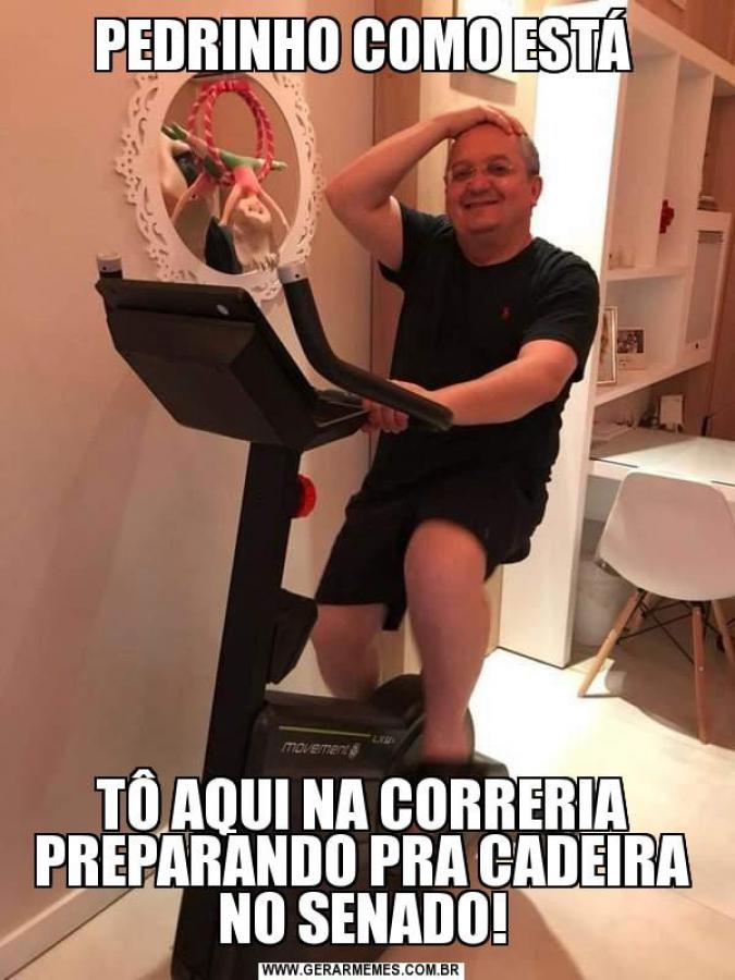 Já Taques é mostrado em uma bicicleta ergométrica com a legenda: Pedrinho, como está? Tô aqui na correria preparando pra cadeira no Senado".